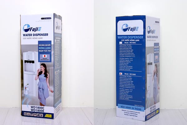 Cây nước nóng lạnh FujiE WD1800E có hình dáng thẳng đứng, toàn thân bên ngoài màu trắng bóng tuyệt đẹp, phần trên cùng là vị trí đặt bình nước, tiếp theo phía trên thân máy là các nút lấy nước rất tiện lợi, vừa tầm với chiều cao người sử dụng. Bên cạnh đó máy còn thiết kế có ngăn chứa đồ khá tiện lợi ở phần dưới cùng của thân máy.