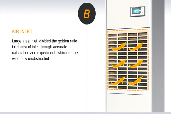 Cửa hút gió được thiết kế theo tiêu chuẩn vàng, rộng để tăng khả năng hút gió. Cửa thoát gió thiết kế phía trên giúp khí khô lan tỏa được nhanh và đều hơn.