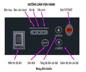 Nhấn nút On/Off ( Tắt mở) máy sẽ bắt đầu vận hành, nhấn thêm lần nữa máy sẽ tắt. Khi đèn vận hành sáng đèn hiển thị độ ẩm sẽ hiển thị độ ẩm cài đặt trước đó ( nếu có sử dụng chức năng ghi nhớ).Hoặc sẽ hiển thị giá trị mặc định là 60% , 3s sau hiển thị giá trị độ ẩm hiện tại trong phòng. Nếu cần thay đổi giá trị cài đặt thì ấn nút tăng hoặc giảm độ ẩm.Nếu độ ẩm cài đặt thấp hơn độ ẩm trong phòg 3% thì máy bắt đầu hoạt động, ngược lại nếu cao hơn máy sẽ ngừng hoạt động.
